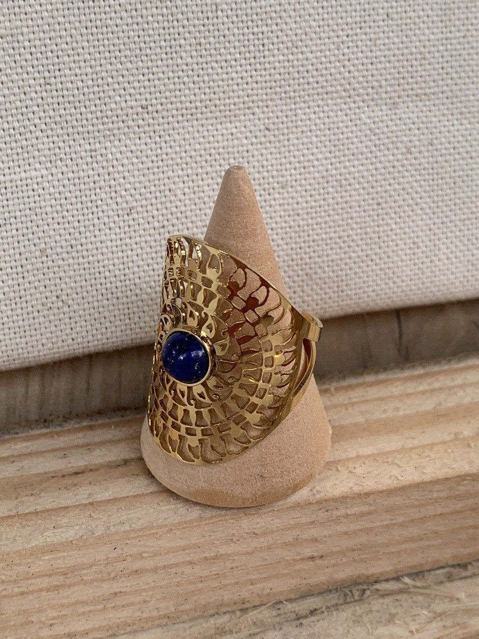 Bague ajustable en acier inoxydable doré ornée d'une pierre naturelle en lapis lazuli.
