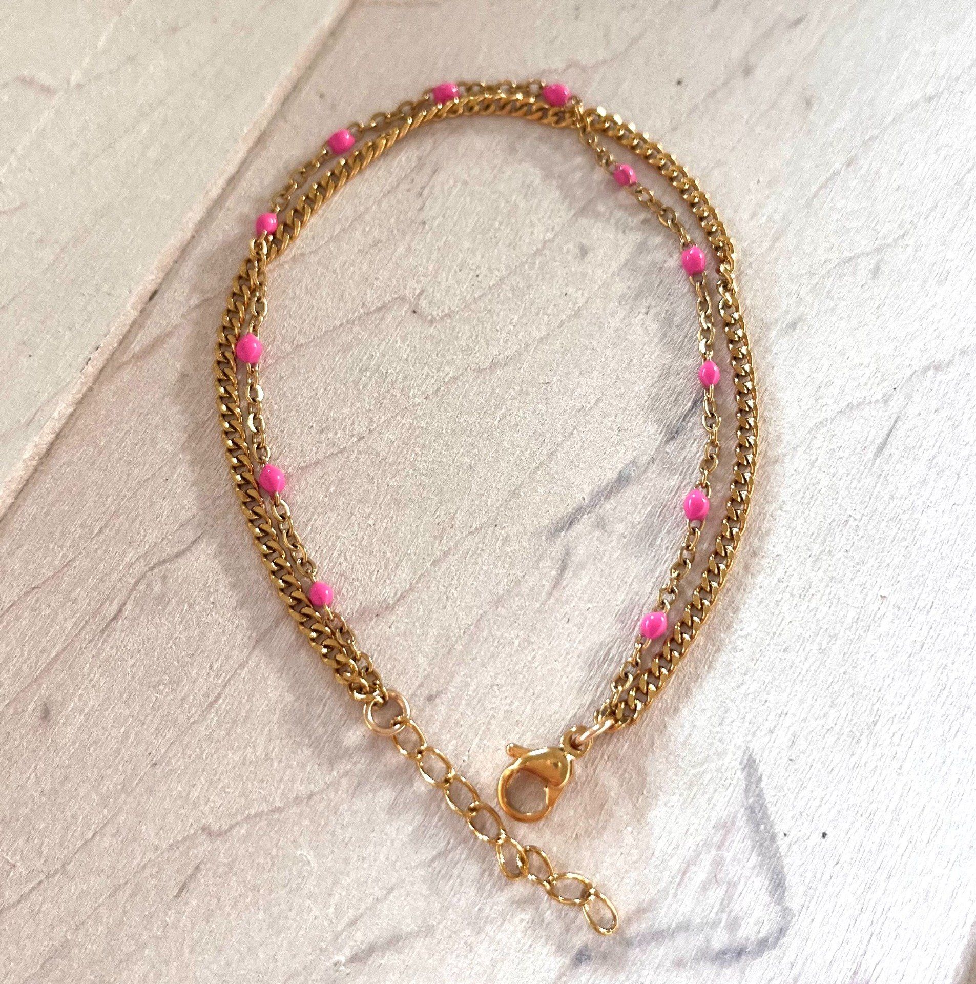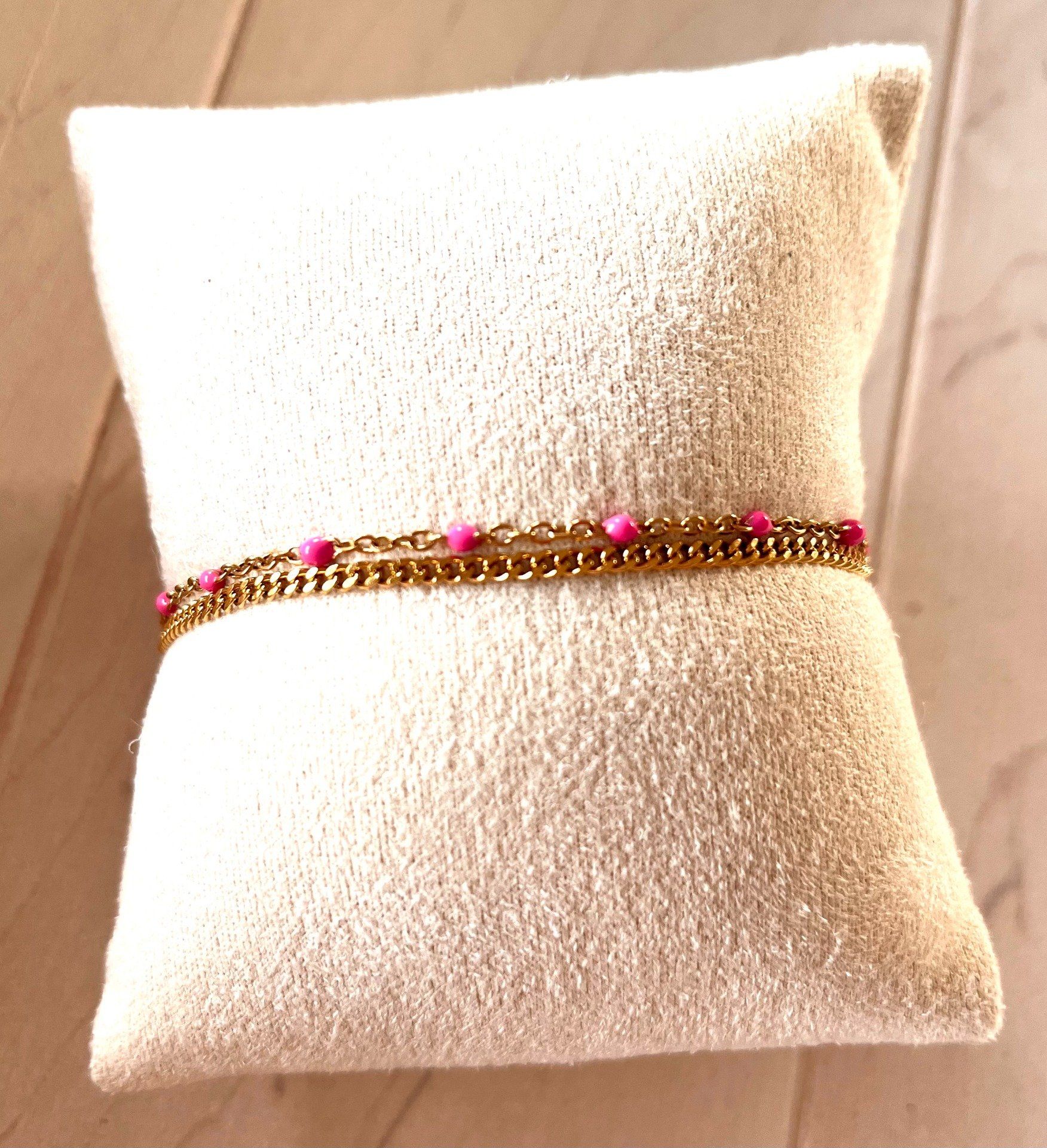 Ce bracelet double associe harmonieusement deux styles intemporels, une chaine à maillon et une chaine perlée délicate.
