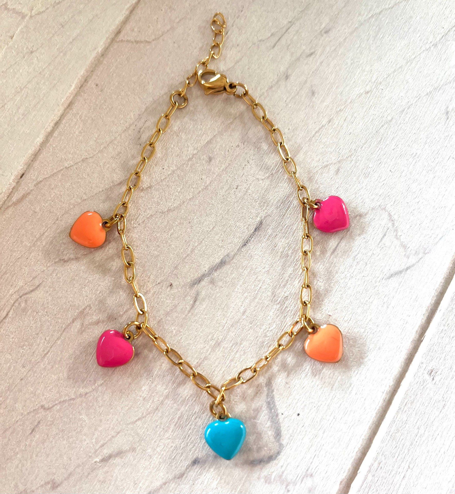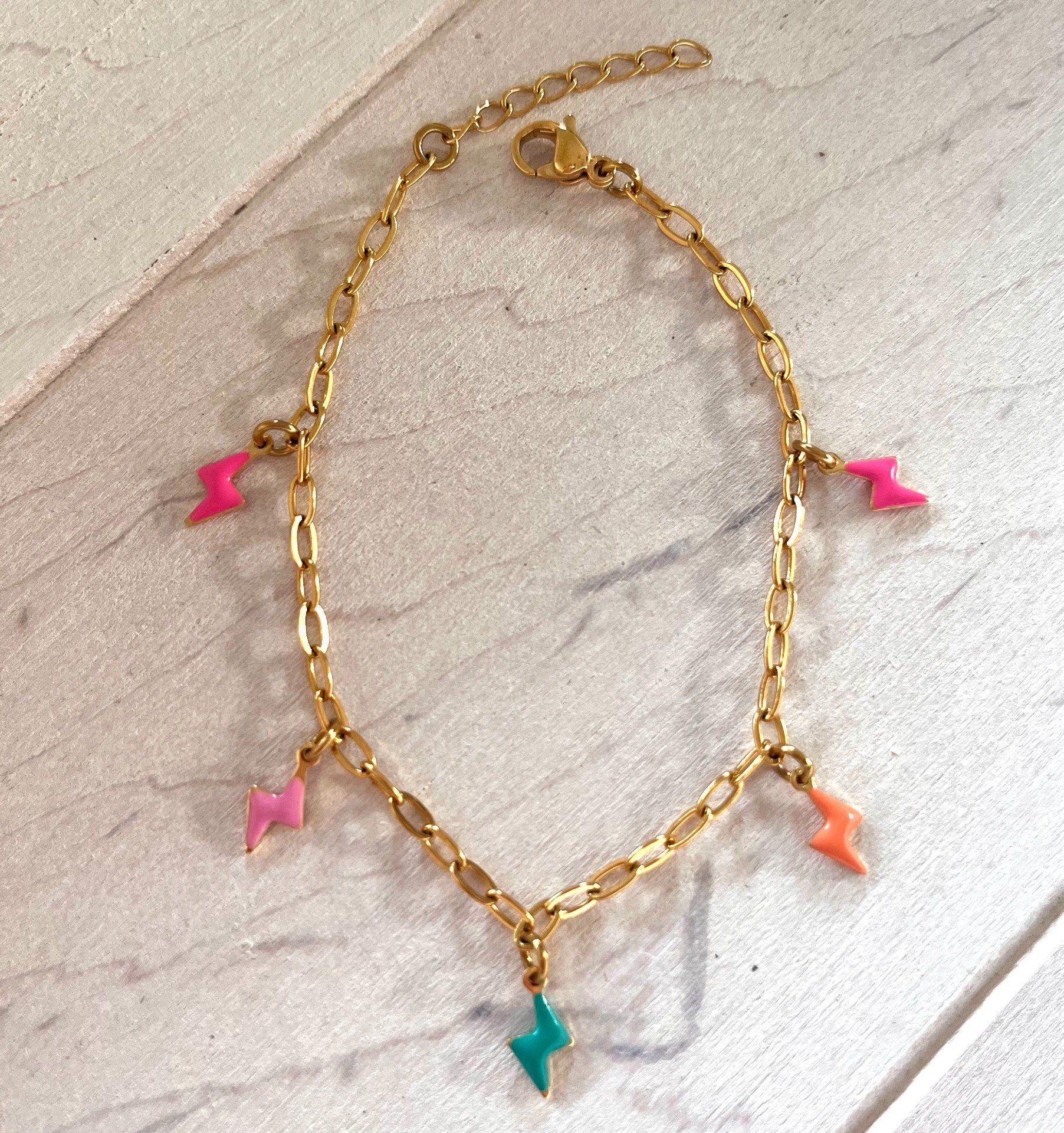 Découvrez ce bracelet dont la fine chaine en acier inoxydable accueille de délicates petites breloques, coeurs ou éclairs.