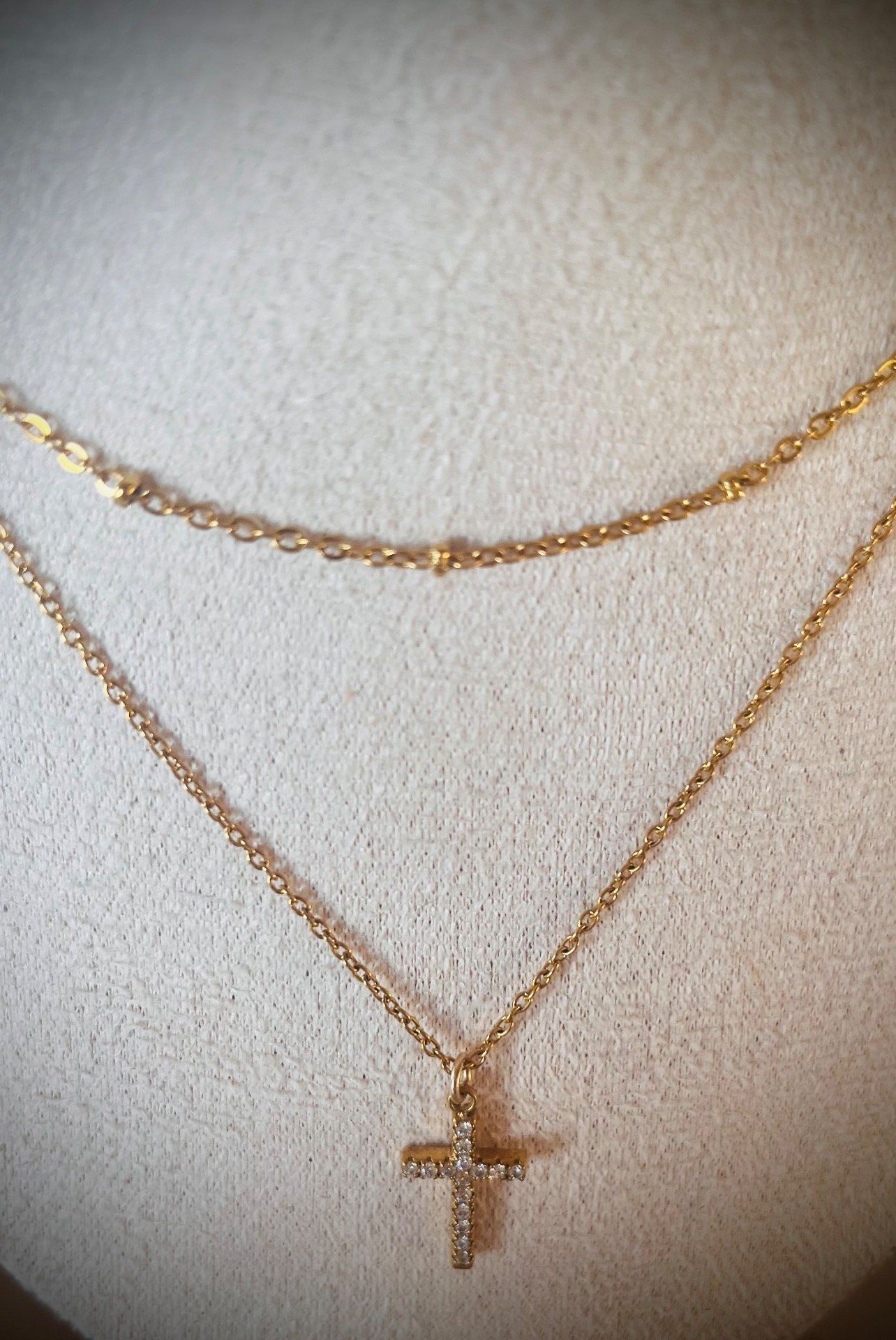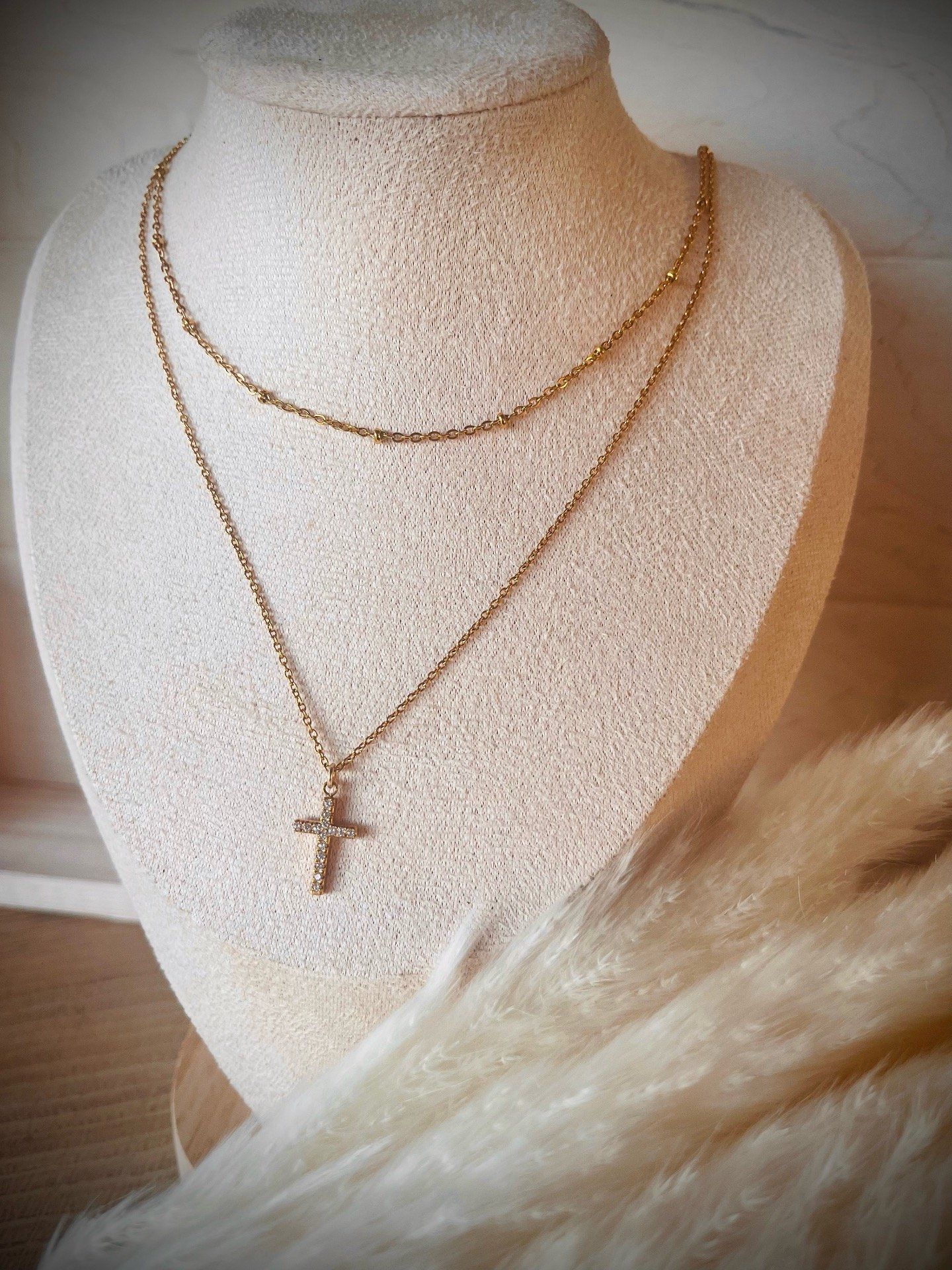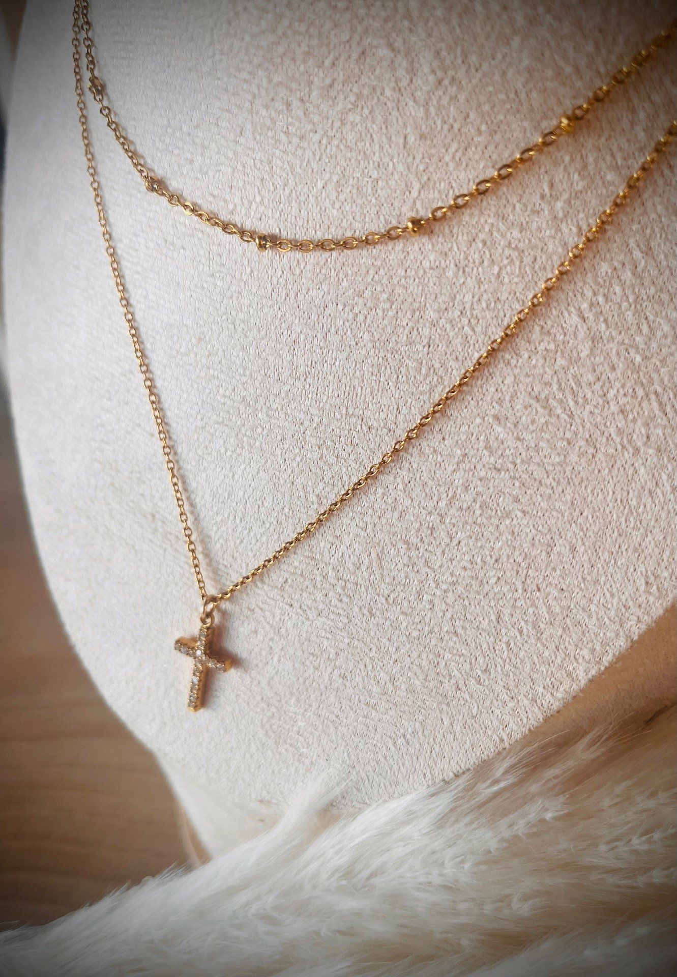 Ce collier double délicatement superposé sublime le decolleté avec son pendentif croix minimaliste, pour une touche de lumière intemporelle.