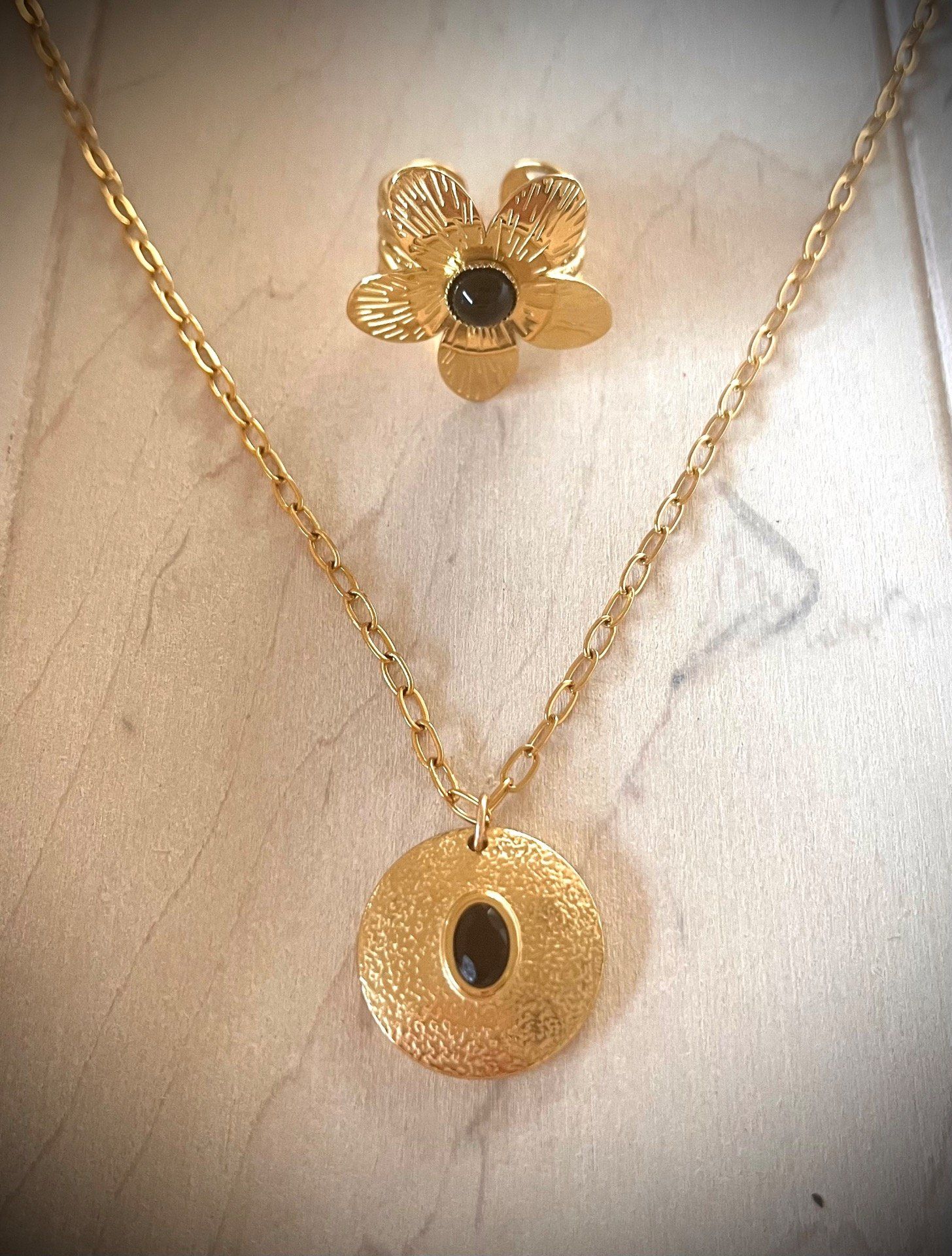Découvrez la parure Mango composée d'un collier et d'une bague en acier inoxydable doré.